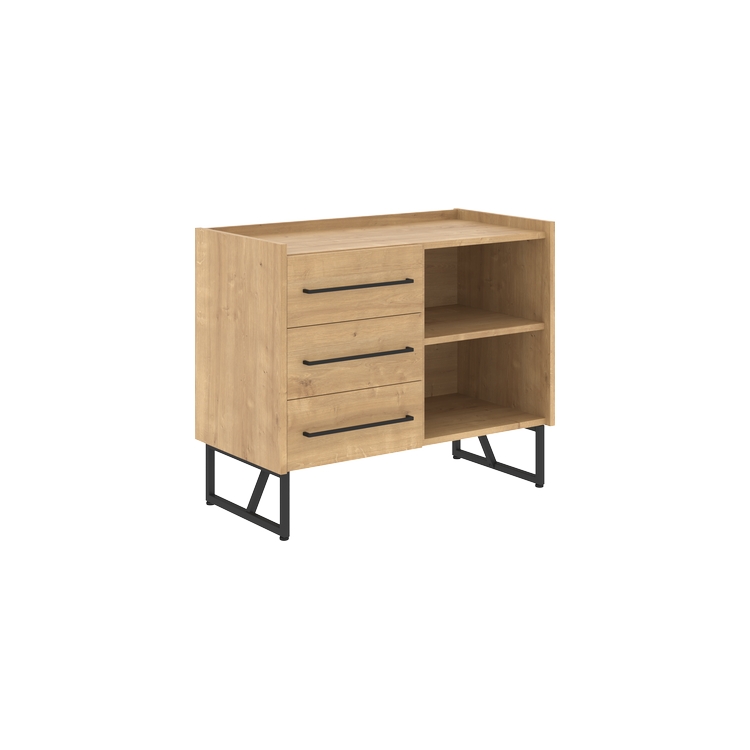 Каркас тумбы из ЛДСП т.18мм с кромками ABS т.0,45 и 2мм. Комплектуется 3-мя ящиками с накладными фасадами и полкой, расположение универсальное. Направляющие шариковые. Ручка металлическая с межцентровым расстоянием 320 мм, цвет - черный. Каркас тумбы устанавливается на металлокаркас из профиля трубы 20х20х1,5мм, цвет металлокаркаса - черный.